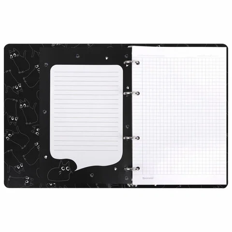 Блок состоит из 120 листов офсетной бумаги белого цвета плотностью 60 г/м2. Линовка – клетка. Обложка выполнена из плотного слим-картона с высечкой под кольцевой механизм, имеет цветной форзац и покрытие матовой пленкой. Формат А5 является стандартным, поэтому тетрадь удобно носить в рюкзаке/ранце или папке.