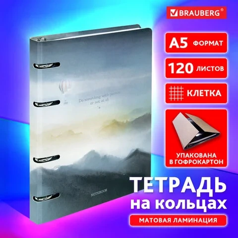 Тетрадь на кольцах А5 160х212 мм, 120 листов, картон, матовая ламинация, клетка, BRAUBERG, 'В горах'