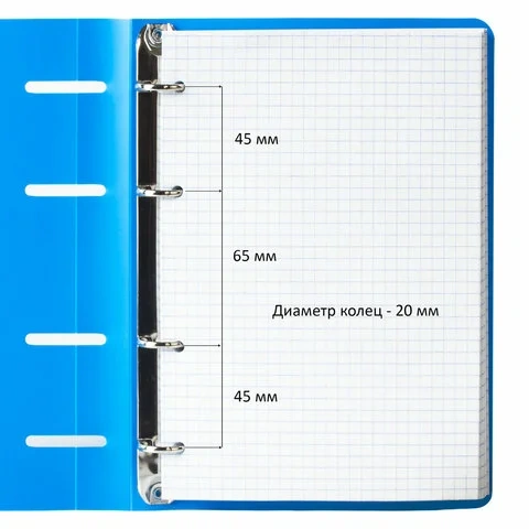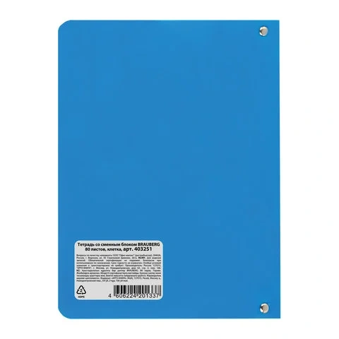 Блок состоит из 80 листов офсетной бумаги белого цвета плотностью 60 г/м2. Линовка - клетка. Обложка с вырубкой под кольца выполнена из износоустойчивого пластика голубого цвета. Формат А5 является стандартным и обеспечивает комфортное ношение в рюкзаке/ранце или папке. Оборудована кольцевым механизмом с 4-мя кольцами для подшивки сменных блоков, что позволит носить на учебу/работу всего одну тетрадь с возможностью добавлять и менять листы.