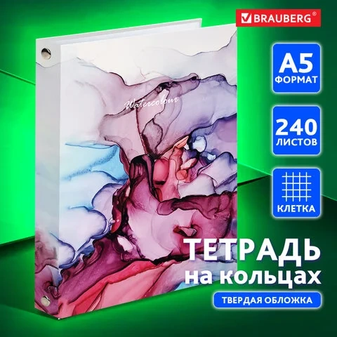 Тетрадь на кольцах А5 (175х215 мм), 240 листов, твердый картон, клетка, BRAUBERG, Акварель, 404096