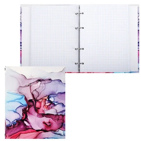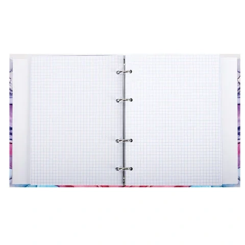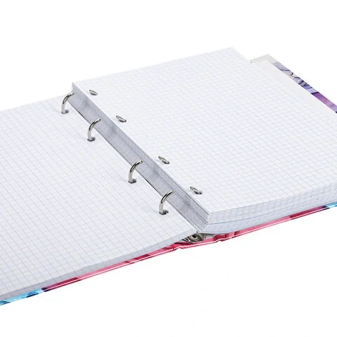 Блок состоит из 240 листов офсетной бумаги белого цвета плотностью 60 г/м2. Листы в нем удобно разделены для вложения в тетрадь по частям, чтобы не перегружать кольцевой механизм. Линовка - клетка. Жесткая книжная обложка выполнена из переплетного картона и покрыта глянцевой пленкой. Формат А5 является стандартным и обеспечивает комфортное ношение в рюкзаке/ранце или папке. Оборудована кольцевым механизмом с 4-мя кольцами для подшивки сменных блоков, что позволит носить на учебу/работу всего одну тетрадь с возможностью добавлять и менять листы. Диаметр колец составляет 20 мм.