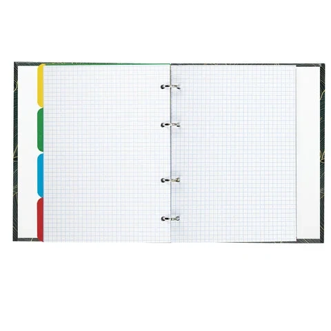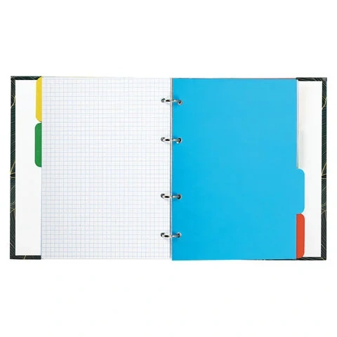 Формат А5 является стандартным и обеспечивает комфортное ношение в рюкзаке или папке. Оборудована кольцевым механизмом с 4 кольцами для подшивки сменных блоков, что позволит носить на учебу или работу всего одну тетрадь с возможностью добавления и замены листов. Тетрадь снабжена разделителями для удобства ведения разных тематик. Диаметр колец составляет 20 мм.