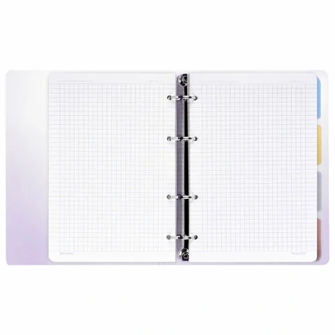 Тетрадь состоит из 120 листов офсетной бумаги плотностью 70 г/м2 с линовкой в клетку. Формат А5 является стандартным и обеспечивает комфортное ношение в рюкзаке/ранце или сумке. Кольцевой механизм позволяет легко сменить внутренний блок на новый, не покупая при этом новую тетрадь. Диаметр колец составляет 25 мм. Одна такая тетрадь способна заменить несколько небольших тетрадей для разного рода информации. Для удобства ведения записей тетрадь снабжена разделителями.