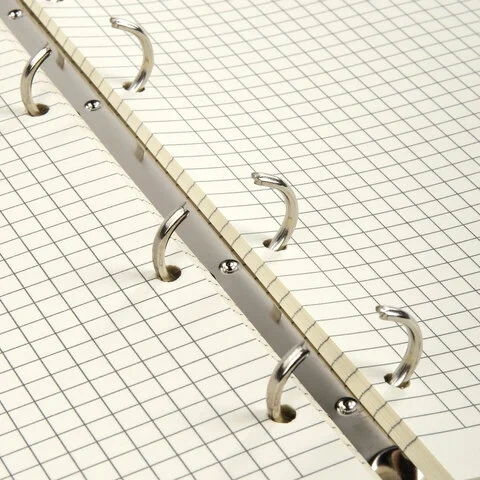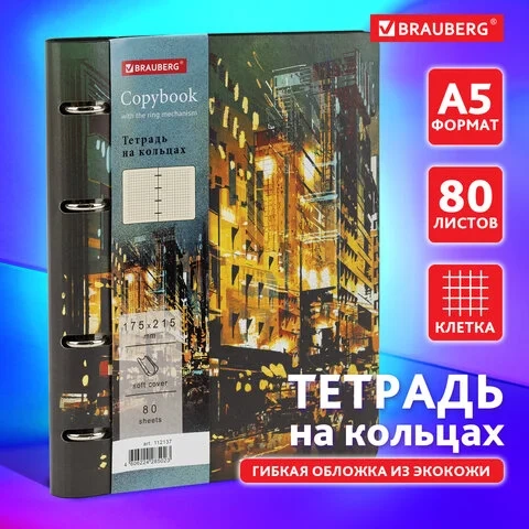 Блок состоит из 80 листов офсетной бумаги кремового цвета плотностью 70 г/м2. Кольцевой механизм с 4-мя кольцами позволяет пользоваться сменным блоком в 120 листов. Линовка - клетка с полями. Мягкая интегральная обложка с вырубкой под кольца выполнена из износоустойчивого материала с текстурой под гладкую кожу. Формат А5 удобно носить в рюкзаке/сумке, что позволит брать на учебу/работу всего одну тетрадь с возможностью добавлять и менять листы. Полезный диаметр колец - 20 мм.