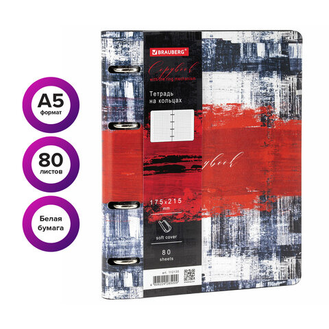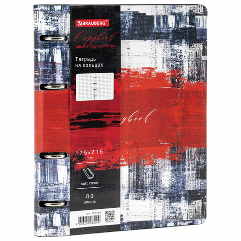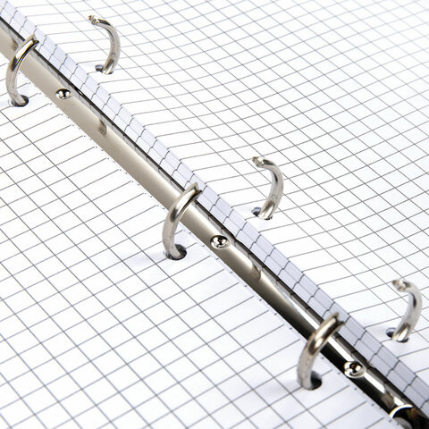 Блок состоит из 80 листов офсетной бумаги белого цвета плотностью 70 г/м2. Кольцевой механизм с 4-мя кольцами позволяет пользоваться сменным блоком в 120 листов. Линовка - клетка с полями. Мягкая интегральная обложка с вырубкой под кольца выполнена из износоустойчивого материала с текстурой под гладкую кожу. Формат А5 удобно носить в рюкзаке/сумке, что позволит брать на учебу/работу всего одну тетрадь с возможностью добавлять и менять листы.