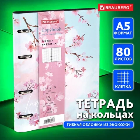 Блок состоит из 80 листов офсетной бумаги белого цвета плотностью 70 г/м2. Кольцевой механизм с 4-мя кольцами позволяет пользоваться сменным блоком в 120 листов. Линовка - клетка с полями. Мягкая интегральная обложка с вырубкой под кольца выполнена из износоустойчивого материала с текстурой под гладкую кожу. Формат А5 удобно носить в рюкзаке/сумке, что позволит брать на учебу/работу всего одну тетрадь с возможностью добавлять и менять листы. Полезный диаметр колец - 20 мм.