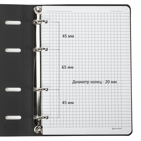 Блок состоит из 80 листов офсетной бумаги белого цвета плотностью 70 г/м2. Кольцевой механизм с 4-мя кольцами позволяет пользоваться сменным блоком в 120 листов. Линовка - клетка с полями. Мягкая интегральная обложка с вырубкой под кольца выполнена из износоустойчивого материала с текстурой под гладкую кожу. Формат А5 удобно носить в рюкзаке/сумке, что позволит брать на учебу/работу всего одну тетрадь с возможностью добавлять и менять листы.