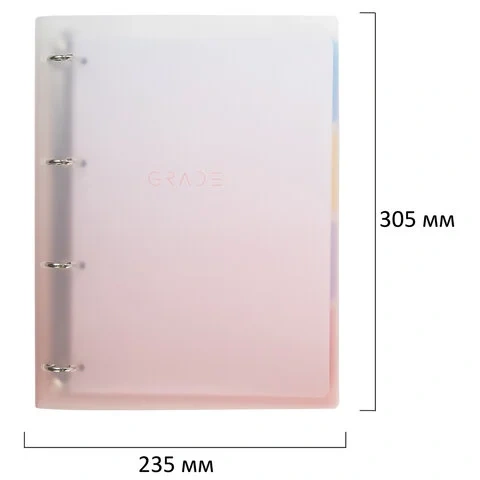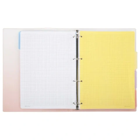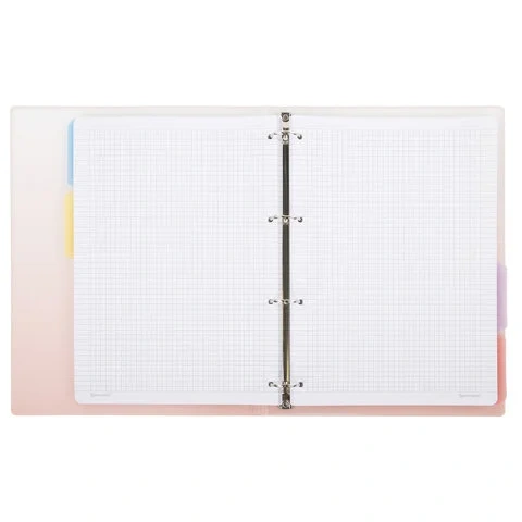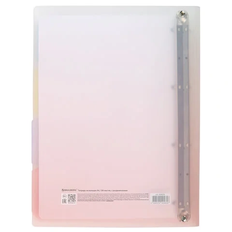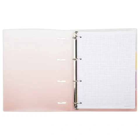 Тетрадь состоит из 120 листов офсетной бумаги плотностью 70 г/м2 с линовкой в клетку. Увеличенный формат А4 предназначен для ведения большого объема записей. Кольцевой механизм позволяет легко сменить внутренний блок на новый, не покупая при этом новую тетрадь. Диаметр колец составляет 25 мм. Одна такая тетрадь способна заменить несколько небольших тетрадей для разного рода информации. Для удобства ведения записей тетрадь снабжена разделителями.