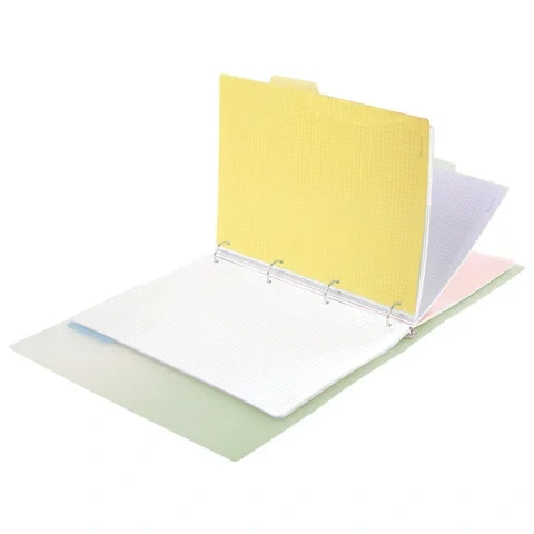 Тетрадь состоит из 120 листов офсетной бумаги плотностью 70 г/м2 с линовкой в клетку. Увеличенный формат А4 предназначен для ведения большого объема записей. Кольцевой механизм позволяет легко сменить внутренний блок на новый, не покупая при этом новую тетрадь. Диаметр колец составляет 25 мм. Одна такая тетрадь способна заменить несколько небольших тетрадей для разного рода информации. Для удобства ведения записей тетрадь снабжена разделителями.