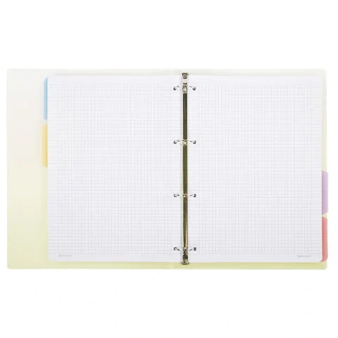 Тетрадь состоит из 120 листов офсетной бумаги плотностью 70 г/м2 с линовкой в клетку. Увеличенный формат А4 предназначен для ведения большого объема записей. Кольцевой механизм позволяет легко сменить внутренний блок на новый, не покупая при этом новую тетрадь. Диаметр колец составляет 25 мм. Одна такая тетрадь способна заменить несколько небольших тетрадей для разного рода информации. Для удобства ведения записей тетрадь снабжена разделителями.