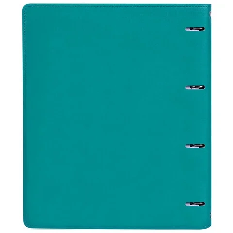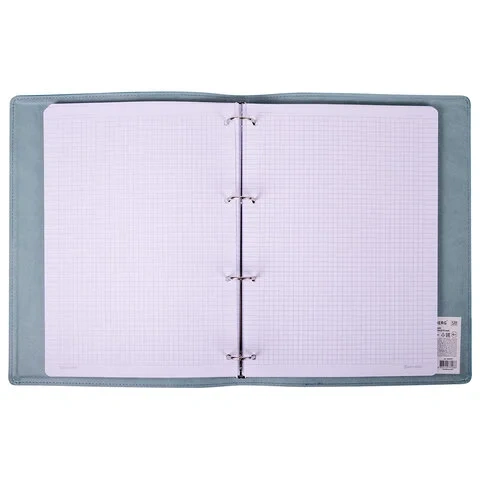 Тетрадь состоит из 120 листов офсетной бумаги плотностью 70 г/м2 с линовкой в клетку и полями. Обложка тетради с однотонным дизайном стилизована под фактурную кожу бирюзового цвета и прошита по периметру. Увеличенный формат А4 предназначен для ведения большого объема записей. Кольцевой механизм позволяет легко сменить внутренний блок на новый, не покупая при этом новую тетрадь. Полезный диаметр колец – 25 мм. Одна такая тетрадь способна заменить несколько небольших тетрадей для разного рода информации.