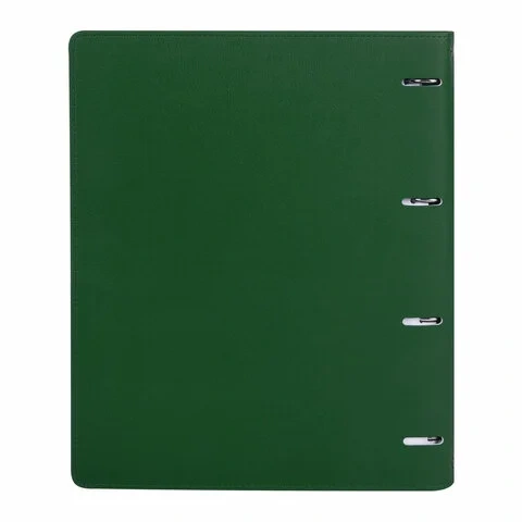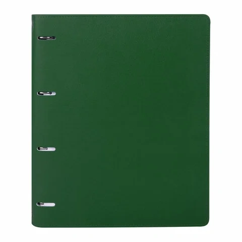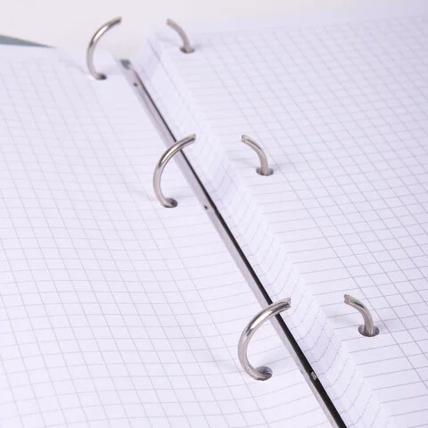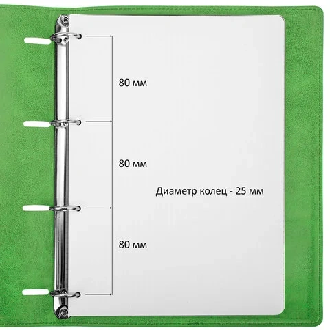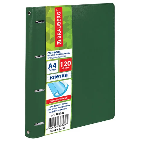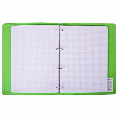 Тетрадь состоит из 120 листов офсетной бумаги плотностью 70 г/м2 с линовкой в клетку и полями. Обложка тетради с однотонным дизайном стилизована под фактурную кожу зеленого цвета и прошита по периметру. Увеличенный формат А4 предназначен для ведения большого объема записей. Кольцевой механизм позволяет легко сменить внутренний блок на новый, не покупая при этом новую тетрадь. Полезный диаметр колец – 25 мм. Одна такая тетрадь способна заменить несколько небольших тетрадей для разного рода информации.