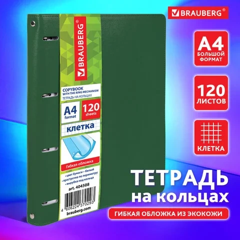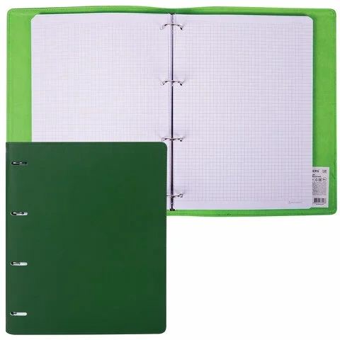 Тетрадь на кольцах БОЛЬШАЯ А4 (240х310 мм), 120 листов, под кожу, клетка, BRAUBERG 'Joy', зелёный/св