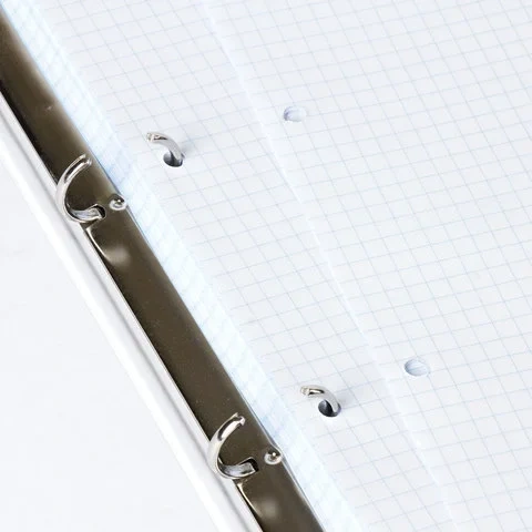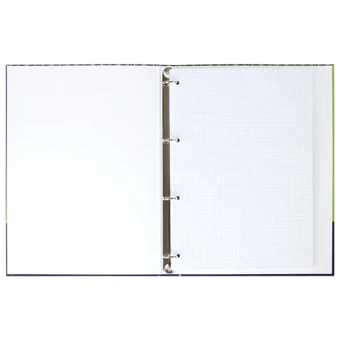 Блок состоит из 100 листов офсетной бумаги белого цвета плотностью 60 г/м2. Линовка - клетка. Жесткая книжная обложка выполнена из переплетного картона и покрыта глянцевой пленкой. Увеличенный формат А4 предназначен для ведения большего объема записей. Оборудована кольцевым механизмом с 4-мя кольцами для подшивки сменных блоков, что позволит носить на учебу/работу всего одну тетрадь с возможностью добавлять и менять листы.