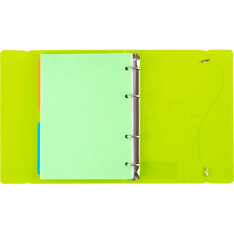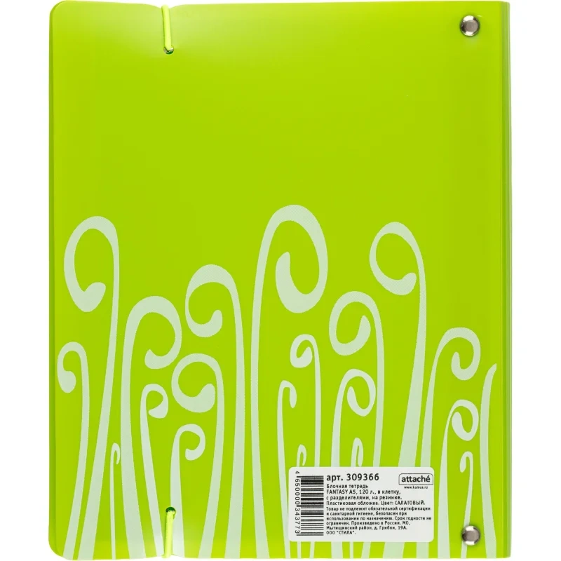 Бизнес-тетрадь Attache Fantasy выполнена в стильном салатовом цвете с твёрдой обложкой из износоустойчивого пластика, обладающего приятной текстурой. В комплекте идёт съёмная линейка-закладка и два съёмных цветных разделителя, что помогает организовать записи и улучшить удобство работы с тетрадью. Есть фиксирующая резинка.