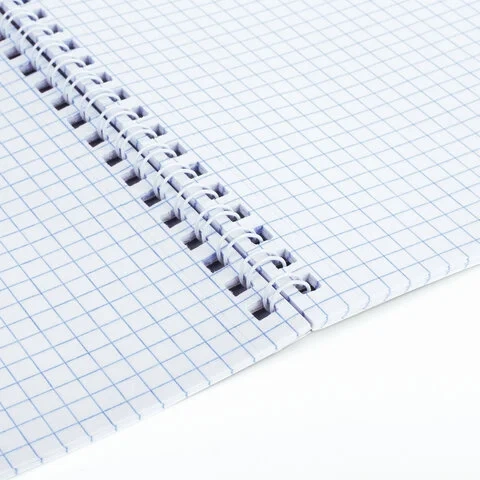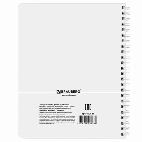 Внутренний блок содержит 96 листов офсетной бумаги плотностью 60 г/м2. Обложка изготовлена из мелованного картона. Линовка - клетка. Евроспираль надежно скрепляет листы между собой. Белизна - 100%. Формат А5.