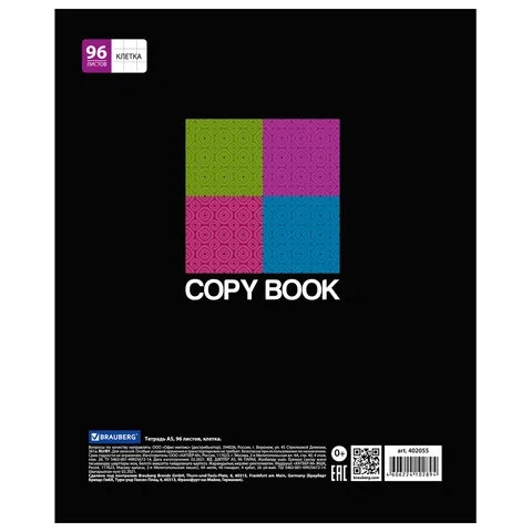 Внутренний блок содержит 96 листов офсетной бумаги плотностью 60 г/м2. Обложка изготовлена из мелованного картона. Линовка - клетка с полями. Скрепка надежно скрепляет листы между собой. Белизна - 92%. Формат А5.