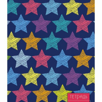 Общая тетрадь формата А5. Внутренний блок выполнен из офсетной бумаги плотностью 60 г/кв.м и состоит из 48 листов в клетку с полями. Линовка синяя. Обложка изготовлена из офсета 120 г/кв.м. Дизайн обложки Звёздный паттерн. Блок и обложка скреплены металлическими скобами.