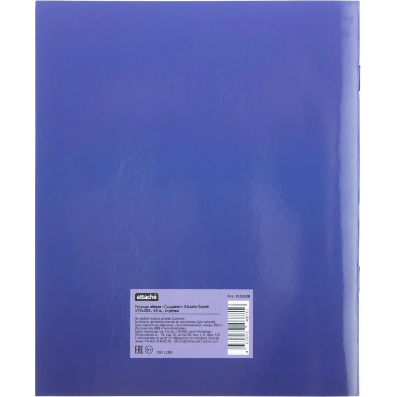 Тетрадь общая А5 48л Attache Градиент Синий клетка, 65г, скрепка, УФ-лак Тетрадь общая Attache Градиент - тетрадь формата А5 для ведения записей. Состоит из мягкой картонной обложки (не однотонная) и 48 листов офсетной бумаги. Размер одного листа составляет 17x20,3 сантиметра. Листовая бумага у данной тетради имеет 100% белый цвет при серой линовке 'в клетку' (с полями). Плотность равна 60 граммам/квадратный метр. Листы надежно крепятся с обложкой с помощью скрепок. Тетрадь не имеет перфорации и разделителей. Дизайн тетради Attache Градиент выполнен в комбинированном цвете с синеватыми оттенками, которые подчеркивают презентабельность и деловой стиль тетради. Она станет идеальным выбором для учебы, офисных будней или же просто как личный ежедневник.