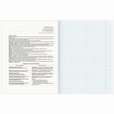 Тетрадь 'Обществознание' формата А5 (165х202 мм) содержит 48 листов, изготовленных из высококачественной офсетной бумаги плотностью 60 г/м2 и белизной 100%. Листы соединены скобами. Линовка блока - в клетку, поля красные. Обложка выполнена из мелованного картона плотностью 190 г/м2 в тематике соответствующего предмета. Благодаря глянцевому лаку краски на изображении становятся более яркими и насыщенными. В справочном материале собраны основные подсказки по школьному предмету для учащихся.