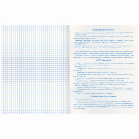 Тетрадь 'Информатика' формата А5 (165х205 мм) содержит 48 листов, изготовленных из высококачественной офсетной бумаги плотностью 60 г/м2, белизной 100%. Листы соединены скобами. Линовка блока - в клетку, поля красные. Обложка выполнена из мелованного картона плотностью 190 г/м2 в тематике соответствующего предмета. Благодаря глянцевому лаку краски на изображении становятся более яркими и насыщенными, исключается возможное истирание рисунка. В справочном материале собраны основные подсказки по школьному предмету для учащихся.