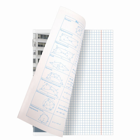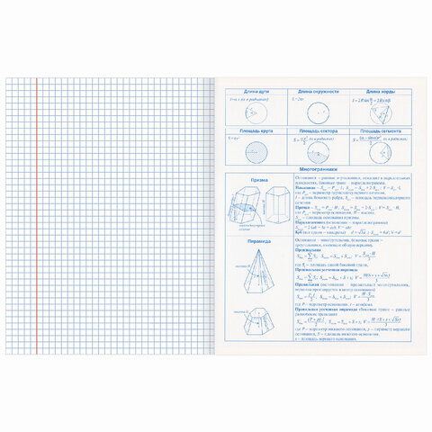 Тетрадь 48 листов 'Геометрия', формат А5 (165х205 мм). Изготовлена из высококачественной офсетной бумаги плотностью 60 г/м2, белизной 100%. Листы соединены скобами. Линовка блока - в клетку, поля красные. Обложка выполнена из мелованного картона плотностью 190 г/м2. В справочном материале собраны основные подсказки по школьному предмету для учащихся.