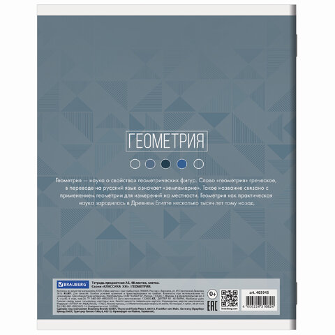 Тетрадь предметная КЛАССИКА XXI 48 л., обложка картон, ГЕОМЕТРИЯ, клетка, подсказ, BRAUBERG, 403945