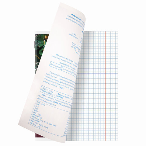Тетрадь 48 листов 'Информатика', формат А5 (165х205 мм). Изготовлена из высококачественной офсетной бумаги плотностью 60 г/м2, белизной 100%. Листы соединены скобами. Линовка блока - в клетку, поля красные. Обложка выполнена из мелованного картона плотностью 190 г/м2. В справочном материале собраны основные подсказки по школьному предмету для учащихся.
