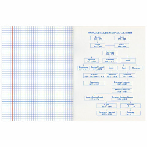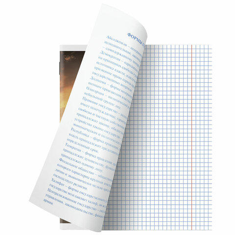 Тетрадь 48 листов 'История', формат А5 (165х205 мм). Изготовлена из высококачественной офсетной бумаги плотностью 60 г/м2, белизной 100%. Листы соединены скобами. Линовка блока - в клетку, поля красные. Обложка выполнена из мелованного картона плотностью 190 г/м2. В справочном материале собраны основные подсказки по школьному предмету для учащихся.