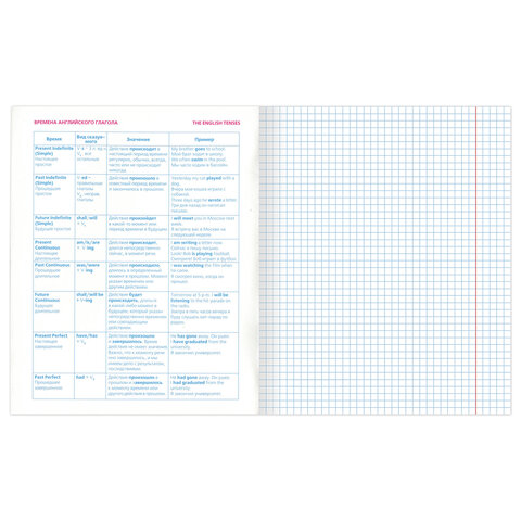 Тетрадь 48 листов 'Английский язык', формат А5 (165х205 мм). Изготовлена из высококачественной офсетной бумаги плотностью 60 г/м2, белизной 100%. Листы соединены скобами. Линовка блока - в клетку, поля красные. Обложка выполнена из мелованного картона в тематике соответствующего предмета. Спецэффект 'выборочный лак' придает изображениям яркость и выразительность. В справочном материале собраны основные подсказки по школьному предмету для учащихся.