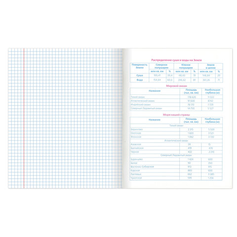 Тетрадь 48 листов 'География', формат А5 (165х205 мм). Изготовлена из высококачественной офсетной бумаги плотностью 60 г/м2, белизной 100%. Листы соединены скобами. Линовка блока - в клетку, поля красные. Обложка выполнена из мелованного картона в тематике соответствующего предмета. Спецэффект 'выборочный лак' придает изображениям яркость и выразительность. В справочном материале собраны основные подсказки по школьному предмету для учащихся.