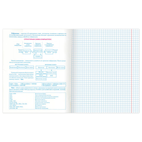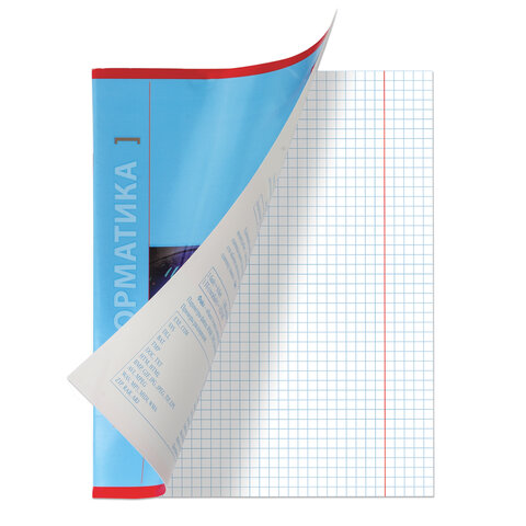 Тетрадь 48 листов 'Информатика', формат А5 (165х205 мм). Изготовлена из высококачественной офсетной бумаги плотностью 60 г/м2, белизной 100%. Листы соединены скобами. Линовка блока - в клетку, поля красные. Обложка выполнена из мелованного картона в тематике соответствующего предмета. Спецэффект 'выборочный лак' придает изображениям яркость и выразительность. В справочном материале собраны основные подсказки по школьному предмету для учащихся.