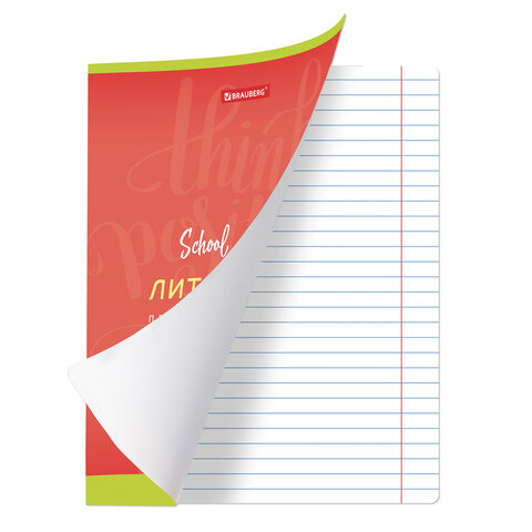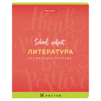 Тетрадь 36 листов 'Литература', формат А5 (165х205 мм). Изготовлена из высококачественной офсетной бумаги плотностью 60 г/м2, белизной 100%. Листы соединены скобами. Линовка блока - в линию, поля красные. Обложка выполнена из мелованной бумаги плотностью 170 г/м2.