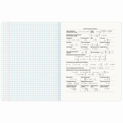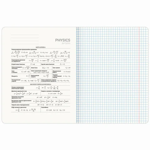 Тетрадь 'Физика' формата А5 (165х202 мм) содержит 48 листов, изготовленных из высококачественной офсетной бумаги плотностью 65 г/м2 и белизной 100%. Листы соединены скобами. Линовка блока - в клетку, поля красные. Обложка выполнена из мелованного картона плотностью 190 г/м2 в тематике соответствующего предмета. Ламинация SoftTouch с тиснением фольгой обеспечивает обложке мягкий, бархатистый тактильный эффект. Углы тетради скруглены. В справочном материале собраны основные подсказки по школьному предмету для учащихся.