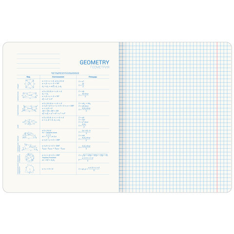 Тетрадь 48 листов 'Геометрия', формат А5 (165х205 мм). Изготовлена из высококачественной офсетной бумаги плотностью 60 г/м2, белизной 100%. Листы соединены скобами. Линовка блока - в клетку, поля красные. Обложка выполнена из мелованного картона в тематике соответствующего предмета. Спецэффект 'выборочный TWIN лак' придает изображениям оригинальность и выразительность. В справочном материале собраны основные подсказки по школьному предмету для учащихся.