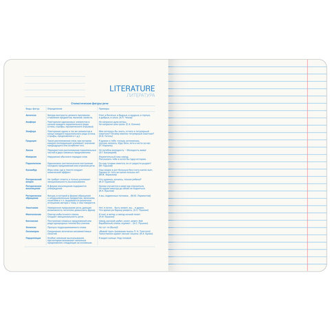 Тетрадь 48 листов 'Литература', формат А5 (165х205 мм). Изготовлена из высококачественной офсетной бумаги плотностью 60 г/м2, белизной 100%. Листы соединены скобами. Линовка блока - в линию, поля красные. Обложка выполнена из мелованного картона в тематике соответствующего предмета. Спецэффект 'выборочный TWIN лак' придает изображениям оригинальность и выразительность. В справочном материале собраны основные подсказки по школьному предмету для учащихся.