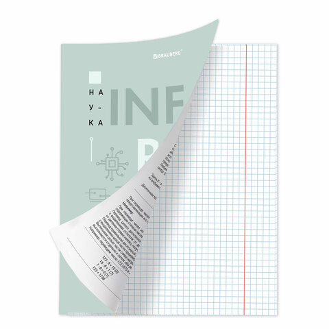 Тетрадь 48 листов 'Информатика', формат А5 (165х202 мм). Изготовлена из высококачественной офсетной бумаги плотностью 60 г/м2, белизной 100%. Листы соединены скобами. Линовка блока - в клетку, поля красные. Обложка выполнена из мелованного картона плотностью 190 г/м2. В справочном материале собраны основные подсказки по школьному предмету для учащихся.
