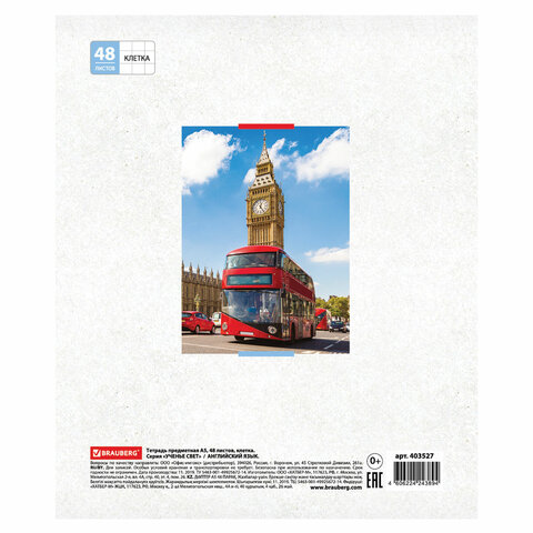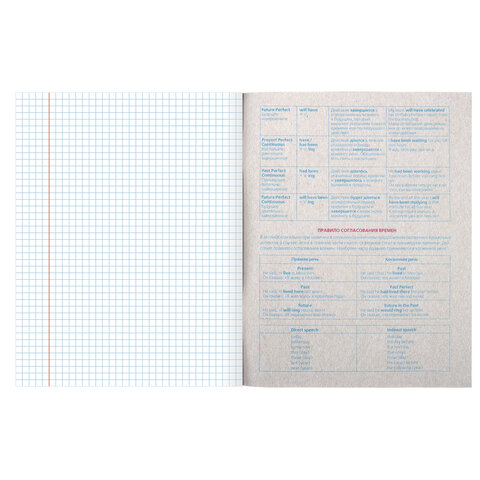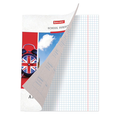 Тетрадь 48 листов 'Английский язык', формат А5 (165х205 мм). Изготовлена из высококачественной офсетной бумаги плотностью 60 г/м2, белизной 100%. Листы соединены скобами. Линовка блока - в клетку, поля красные. Обложка выполнена из мелованного картона в тематике соответствующего предмета. В справочном материале собраны основные подсказки по школьному предмету для учащихся.