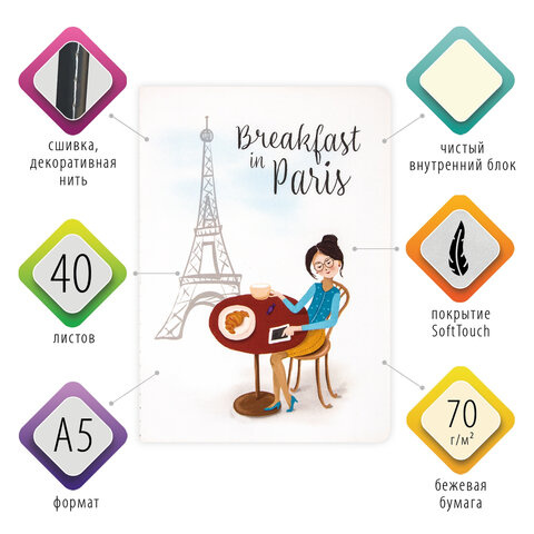 Общая тетрадь формата А5 содержит 40 листов без линовки, что позволяет не только писать, но и делать зарисовки и наброски карандашом, линером, ручкой. Сшивка плотно соединяет листы. Обложка изготовлена из высококачественного импортного картона с двусторонней запечаткой, что придает тетради изысканный и неповторимый стиль. Специальное покрытие 'SoftTouch' с повышенными тактильными свойствами придает обложке мягкий, бархатистый эффект. Внутренний блок - тонированная офсетная бумага цвета слоновой кости плотностью 70 г/м2.