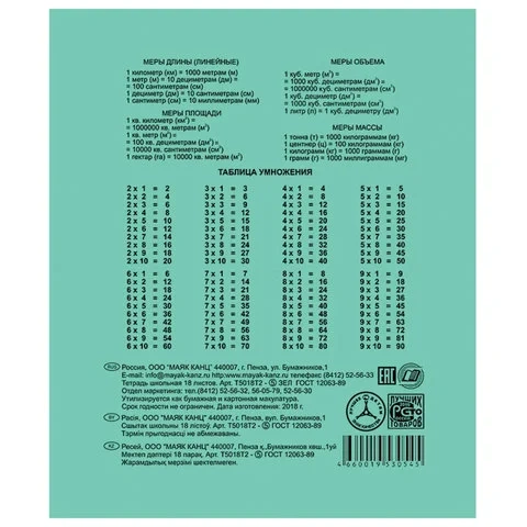 Тетрадь ЗЕЛЁНАЯ обложка 18 листов 'Маяк', офсет, клетка с полями, Т5018Т2 5Г