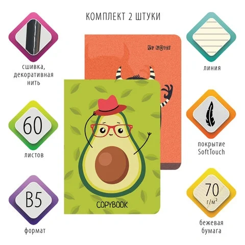 Тетради 60 л. в линию обложка SoftTouch, НАБОР 2 шт., бежевая бумага 70 г/м2, сшивка, B5 (179х250 мм