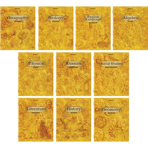 В комплекте 10 тетрадей: Английский язык, Физика, Обществознание, История, Геометрия, Биология, Алгебра, География, Русский язык (в линию), Литература (в линию). Внутренний блок плотностью 60 г/м2. Белая бумага 100% белизны с красными полями. 48 листов. Формат А5. На скрепке. Прямые углы. Длина: 205 мм. Ширина: 165 мм.