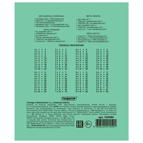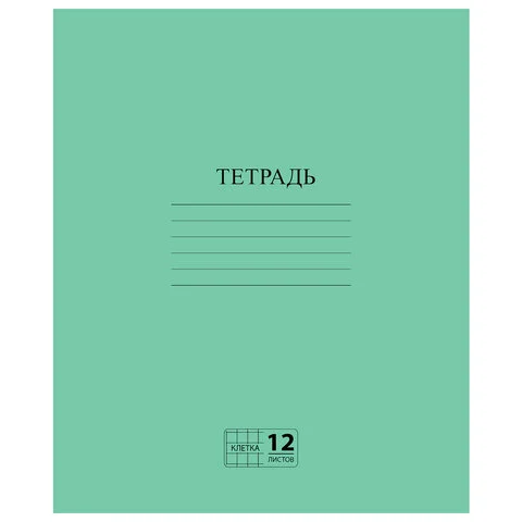 Тетрадь, ЗЕЛЁНАЯ обложка, 12 л., ПИФАГОР, офсет №2 ЭКОНОМ, клетка с полями, 104984