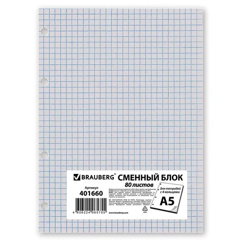 Сменный блок для тетради на кольцах Brauberg белый, А5, 80 листов, в клетку