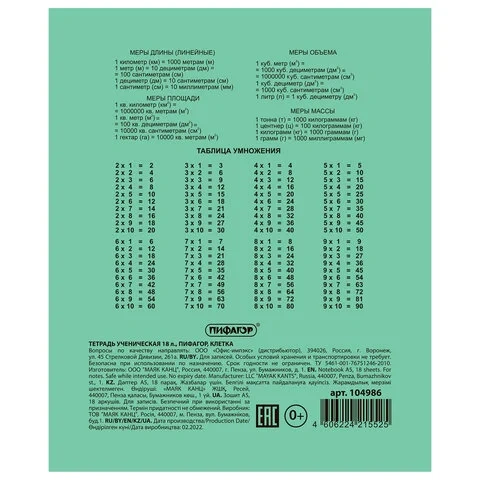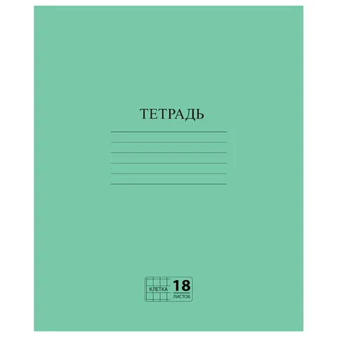 Тетрадь, ЗЕЛЁНАЯ обложка, 18 л., ПИФАГОР, офсет №2 ЭКОНОМ, клетка с полями, 104986