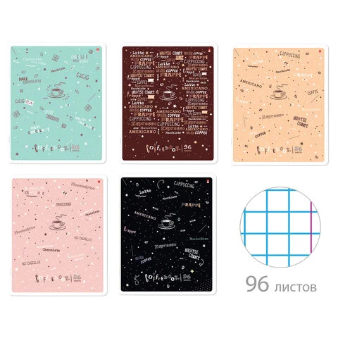 Тетрадь А5 96 л. АЛЬТ скоба, клетка, гибридный лак, 'Coffe time' (5 видов), 7-96-1160