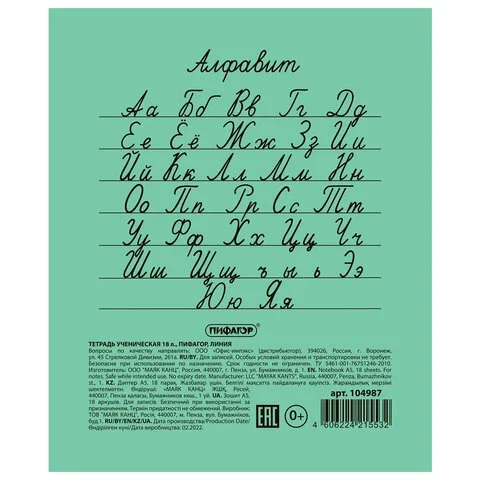 Тетрадь, ЗЕЛЁНАЯ обложка, 18 л., ПИФАГОР, офсет №2 ЭКОНОМ, линия с полями, 104987