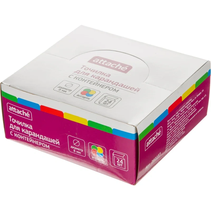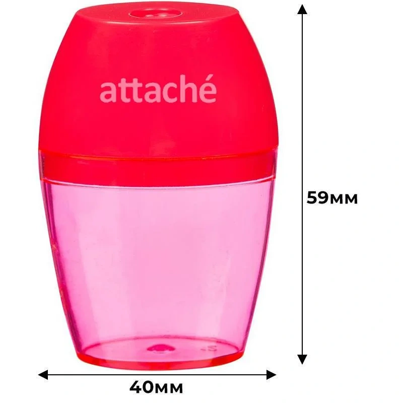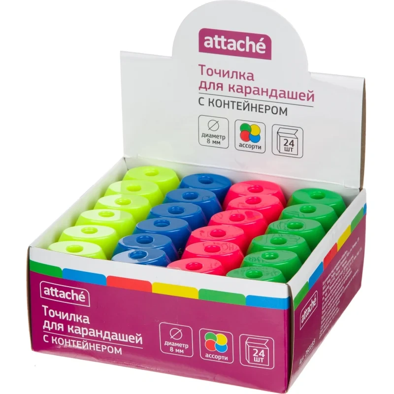 Точилка APS105, на 1 отв., с конт., цвета в ассорт. В рамках ребрендинга производится перевод данного артикула с ТМ Noname на ТМ Attache с сохранением всех потребительских характеристик товара. На переходный период допускается поставка данной продукции в двух вариантах дизайна упаковки. Пластиковая точилка с контейнером для стружки. Предназначена для заточки карандашей диаметром 8 мм. Оснащена металлическим лезвием. Размеры точилки : 59x40x19 мм. Подходит для карандашей с профилем: трехгранные, шестигранные, треугольные. Внимание! Товар поставляется в различных вариантах дизайна/цвета без возможности выбора. Товар относится к ценовому сегменту 'суперэконом'. Имеет упрощенные характеристики и более простую упаковку. Отвечает основным требованиям потребления.