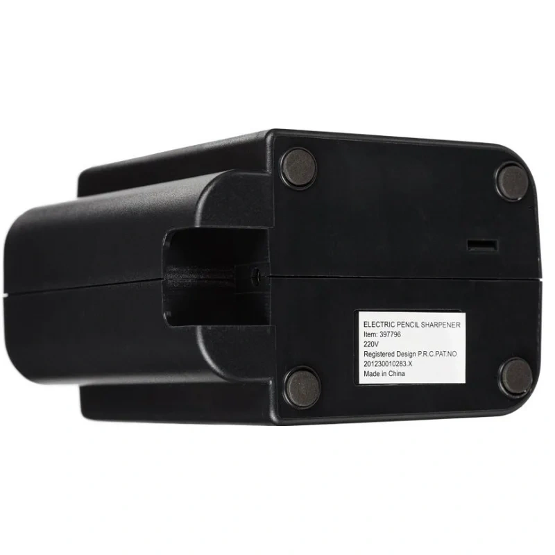 Точилка электрическая c одним отверстием. Изготовлена из пластика черного и белого цвета. Работает от сети 100-120/220-240В. Оснащена большим контейнером для стружки и отделением для карандашей. Предназначена для заточки карандашей диаметром 6,5-8 мм. Автоматическое включение/выключение. В комплект входит АС/DС-адаптер (100-240В). Длина шнура — 152 см. Гарантия 12 месяцев. Размер точилки: 111×77×140 мм. Размер контейнера: 65×45×90 мм. Размер блока питания: 70×40×75 мм. Рекомендовано для использования в дошкольных и школьных учреждениях, а также дома и в офисе.