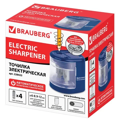Стильный корпус точилки, выполненный из ударопрочного пластика, позволит ей стать интересной деталью любого интерьера, а прочное прямое лезвие осуществляет острую и быструю заточку любых деревянных и пластиковых карандашей. Подходит как для чернографитных, так и для цветных карандашей. Точилка имеет два отверстия для карандашей диаметром 6-8 мм и 9-12 мм, а также оснащена предохранительным клапаном. Помимо прочего обладает противоскользящим основанием. Механизм приходит в движение при помощи электричества от 4 батареек АА (в комплект не входят). Затачивание начинается автоматически после помещения карандаша внутрь точилки и через несколько секунд карандаш идеально заточен и готов к использованию.